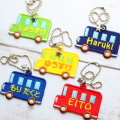 フェルト生地にお名前を刺繍したバスのキーホルダー、乗り物シリーズです。